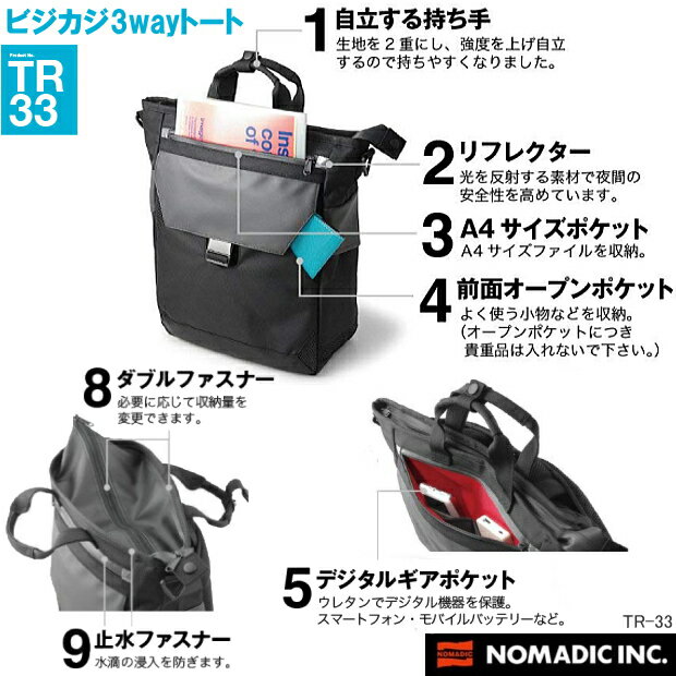 ビジネス&カジュアル、どちらのスタイルにも合わせやすい撥水仕様のビジカジバッグ、「TRシリーズ」登場 ノーマディックの定番人気型、軽量3wayトートバッグ「TR-33」。