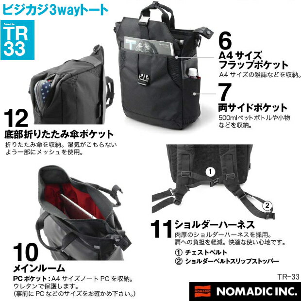 商品名 ノーマディック ビジカジ 3wayトート 品番 TR33 黒/ TR33 紺 サイズ 外寸:タテ39cmxヨコ28cmxマチ12cm 重さ:約)1130g 仕様 ・ポケットの数:7(外側4/内側3) (デジタル小物やファスナーポケット、差込ポケットを配し豊富な収納スペース) ・ショルダーストラップ付き(全長130cm) 持ち手の全長:28.5cm ●開閉には止水ファスナーを採用 ●大きく開き出し入れしやすいメインルーム ●ダブルファスナー仕様で荷物量の変化にも対応 ●ノートPCサイズのウレタン差込ポケット有 ●ペットボトル・スマートフォン・パスケース等小物収納可の両サイドポケット ●折りたたみ傘収納の底ポケット ●上下可動式のチェストベルトで安定感UP 材質 素材にPVC加工を施した撥水仕様450DポリエステルオックスPVC加工×1300Dナイロン メーカー ノーマディック NOMADIC INC. NOMADIC INC. ノーマディック 移動(街歩き・ビジネス・トラベル・ステーショナリー)をテーマとした生活雑貨の企画、生産、販売。