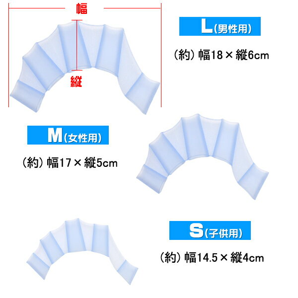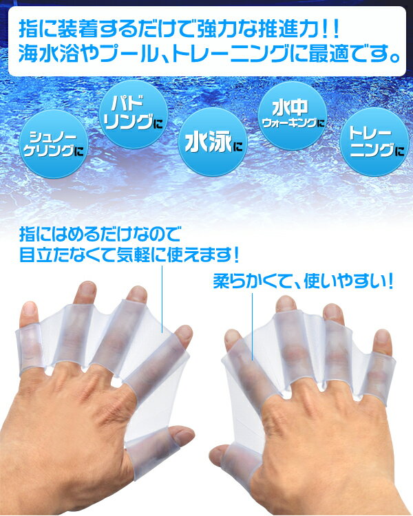 もちろん泳ぐスピードも格段にアップ! ■水中ウォーキングに最適! 指を開いてご使用になると大きく水をつかむことができるので、 水中ウォーキングなどで推進力が増し効果的に運動ができます。