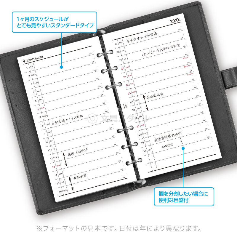【月間・見開き両面1ヶ月リスト式】 月間タイプのスタンダードな見開きリストタイプです。